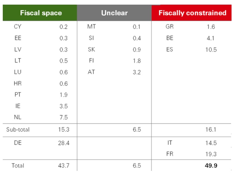While Germany can press ahead with fiscal expansion, other eurozone economies, such as France and Italy, are more constrained. Countries with sufficient fiscal space only amounts to 15 per cent of overall eurozone GDP, so funding solutions may require EU-level action.