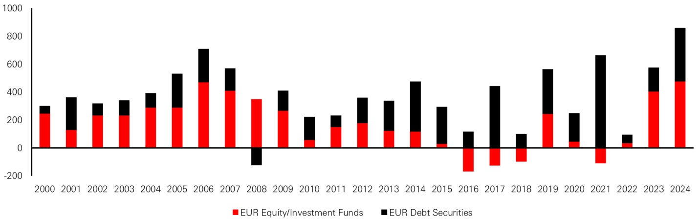 Foreign investment in eurozone sovereign debt has also seen notable shifts. Between 2010 and 2019, foreign investors held an average of 58% of eurozone government debt. However, this figure dropped to a low of 43% in 2022, before showing signs of recovery in 2023 and 2024. This rebound suggests a potential return of confidence in eurozone fixed-income markets, driven by factors such as policy rate adjustments and credit spread dynamics. Interestingly, foreign investors have historically shown a preference for euro-denominated debt securities over equities, particularly during periods of rising interest rates, such as in the late 2000s. However, the euro debt crisis and subsequent quantitative easing policies disrupted this trend, leading to reduced foreign participation until recent years.